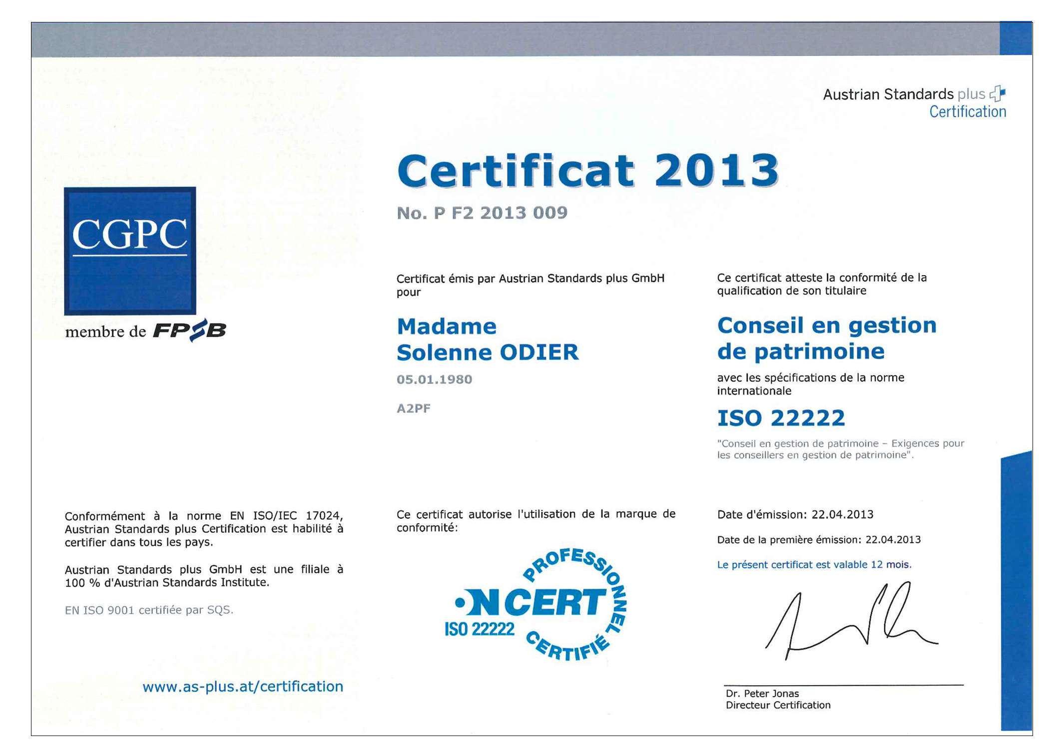 Certification ISO 22222Nos collaborateurs sont certifiés par l'Association Française des Conseils en Gestion de Patrimoine Certifiés, selon la norme ISO 22222 associée à la Gestion de Patrimoine.Cette norme internationale vise à renforcer le besoin d'information et de protection du consommateur. Elle est attribuée sur des critères de compétences, d'expérience, de méthodologie et d'éthique. |